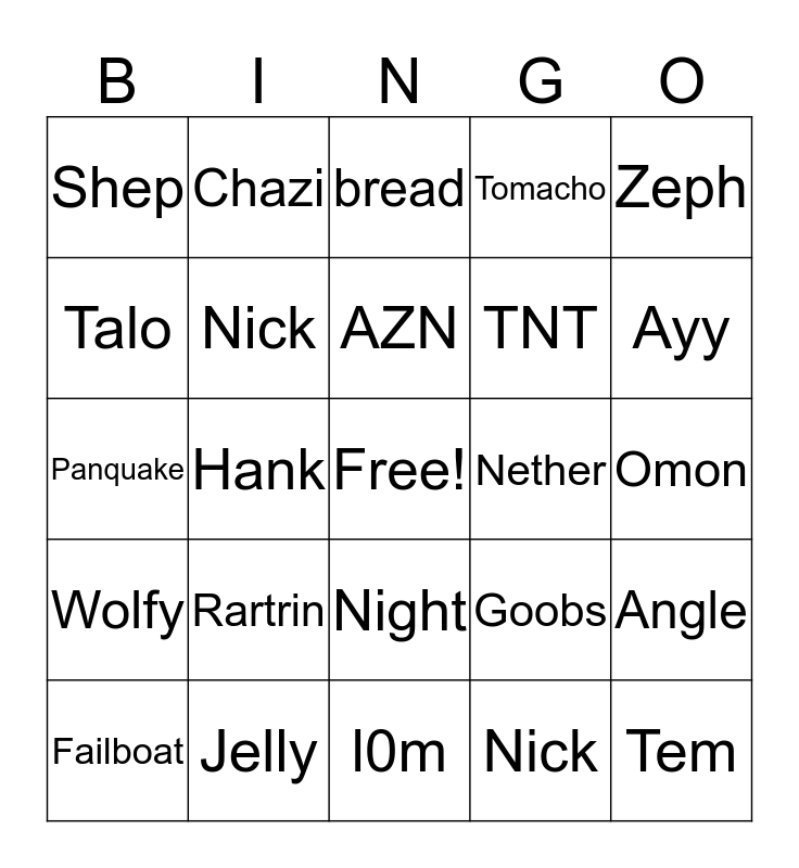 This bingo card has a free space and 24 words: Failboat, Rartrin, AZN, Nick, Zeph, Shep, Chazi, bread, Nether, Omon, Panquake, Nick, Goobs, Angle, Talo, Jelly, l0m, Tomacho, Ayy, Wolfy, Hank, Night, TNT and Tem.