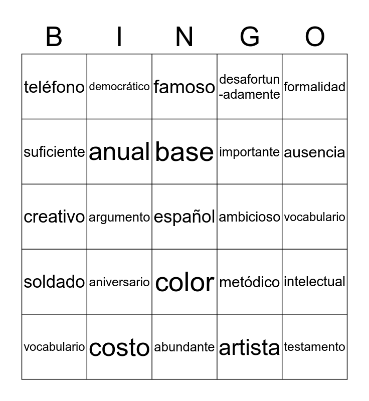 This bingo card has a free space and 24 words: aniversario, costo, base, vocabulario, formalidad, teléfono, suficiente, democrático, ambicioso, color, importante, creativo, metódico, intelectual, anual, artista, vocabulario, famoso, ausencia, argumento, testamento, soldado, desafortun -adamente and abundante.