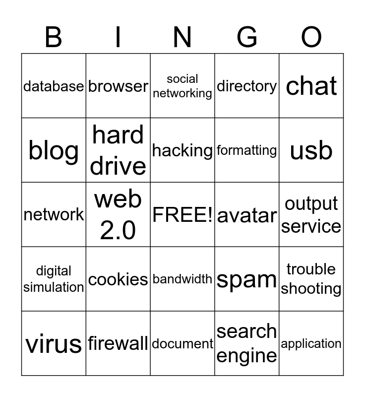 This bingo card has a free space and 24 words: cookies, firewall, hacking, virus, chat, database, blog, browser, avatar, bandwidth, formatting, network, spam, trouble shooting, hard drive, search engine, output service, social networking, usb, web 2.0, application, digital simulation, directory and document.
