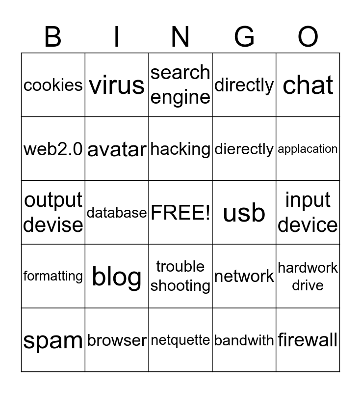 This bingo card has a free space and 24 words: blog, browser, hacking, spam, chat, cookies, web2.0, virus, usb, trouble shooting, dierectly, output devise, network, hardwork drive, avatar, bandwith, input device, search engine, applacation, database, firewall, formatting, directly and netquette.