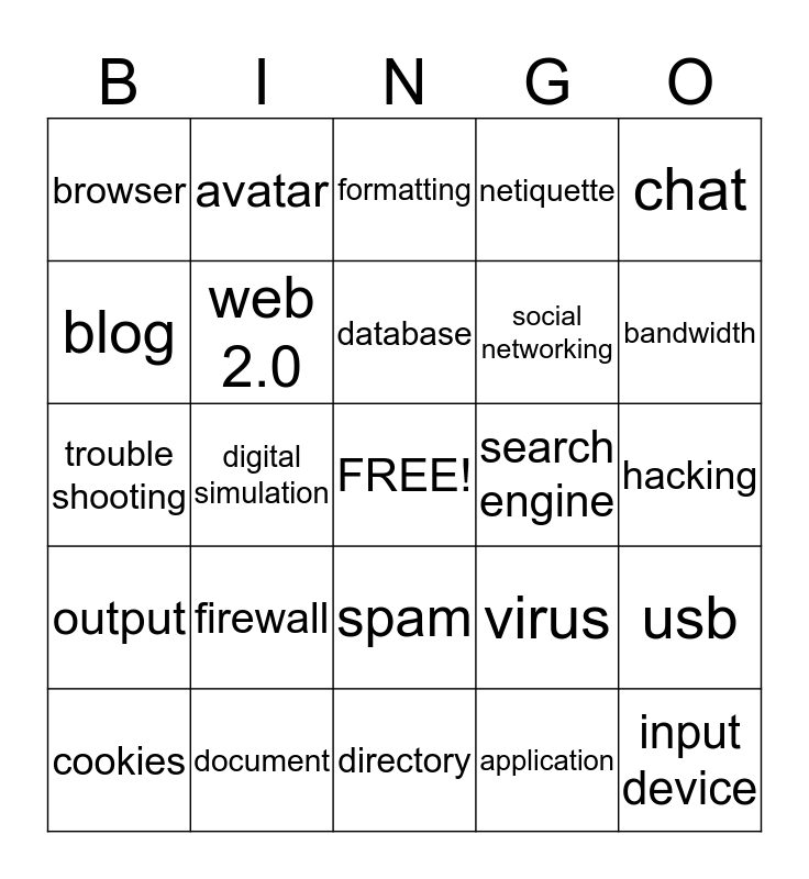 This bingo card has a free space and 24 words: firewall, document, database, cookies, chat, browser, blog, avatar, search engine, spam, social networking, trouble shooting, virus, usb, web 2.0, application, hacking, formatting, bandwidth, digital simulation, input device, output, netiquette and directory.