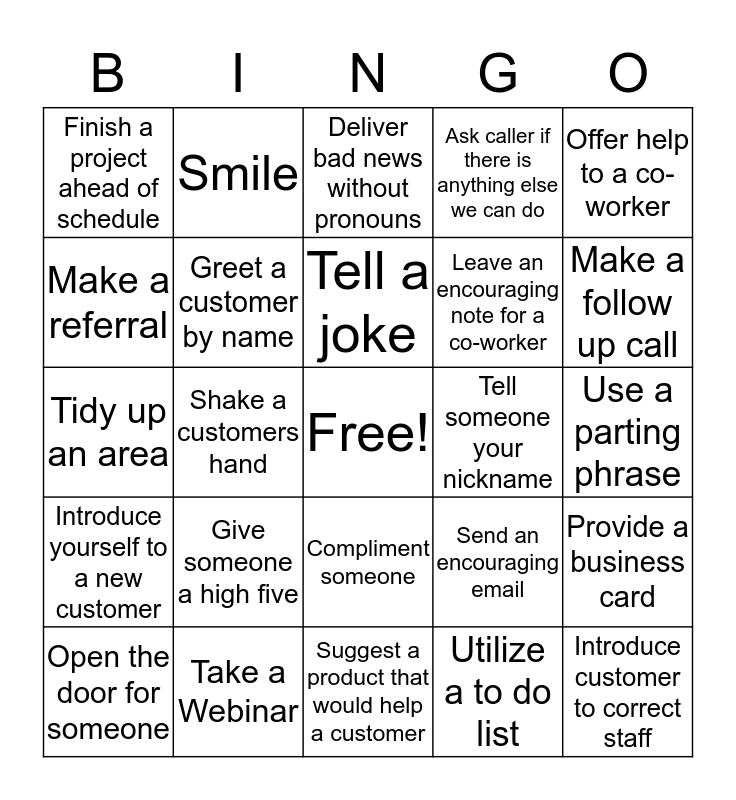 This bingo card has a free space and 24 words: Give someone a high five, Take a Webinar, Tell a joke, Open the door for someone, Offer help to a co-worker, Finish a project ahead of schedule, Make a referral, Smile, Tell someone your nickname, Compliment someone, Leave an encouraging note for a co-worker, Tidy up an area, Send an encouraging email, Provide a business card, Greet a customer by name, Utilize a to do list, Use a parting phrase, Deliver bad news without pronouns, Make a follow up call, Shake a customers hand, Introduce customer to correct staff, Introduce yourself to a new customer, Ask caller if there is anything else we can do and Suggest a product that would help a customer.