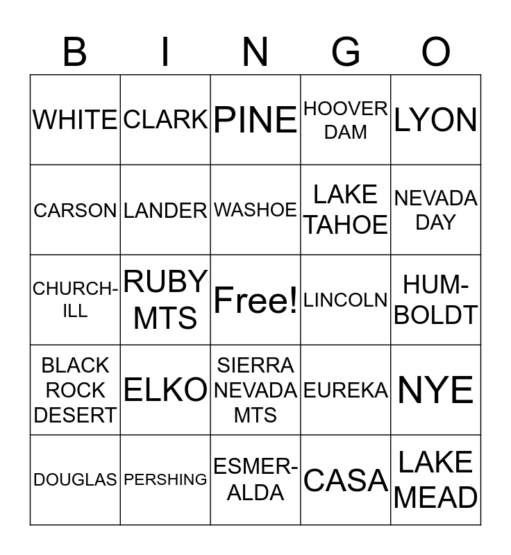This bingo card has a free space and 24 words: DOUGLAS, ELKO, WASHOE, CASA, LYON, WHITE, CLARK, PINE, LINCOLN, HUM-BOLDT, CHURCH-ILL, LANDER, EUREKA, NYE, CARSON, PERSHING, ESMER-ALDA, HOOVER DAM, NEVADA DAY, BLACK ROCK DESERT, RUBY MTS, SIERRA NEVADA MTS, LAKE TAHOE and LAKE MEAD.