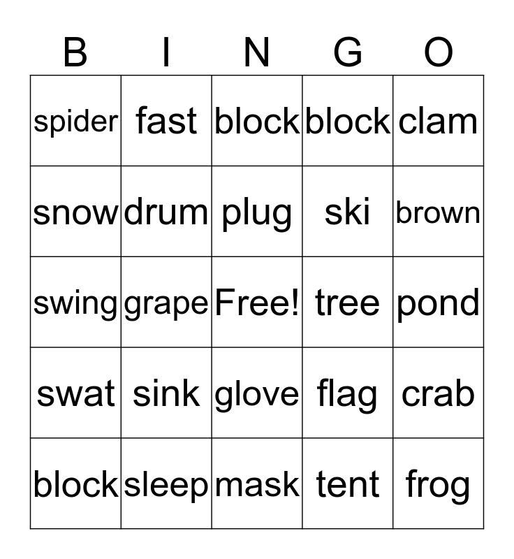 This bingo card has a free space and 24 words: sink, sleep, plug, block, clam, spider, snow, fast, tree, glove, ski, swing, flag, crab, drum, tent, pond, block, brown, grape, frog, swat, block and mask.