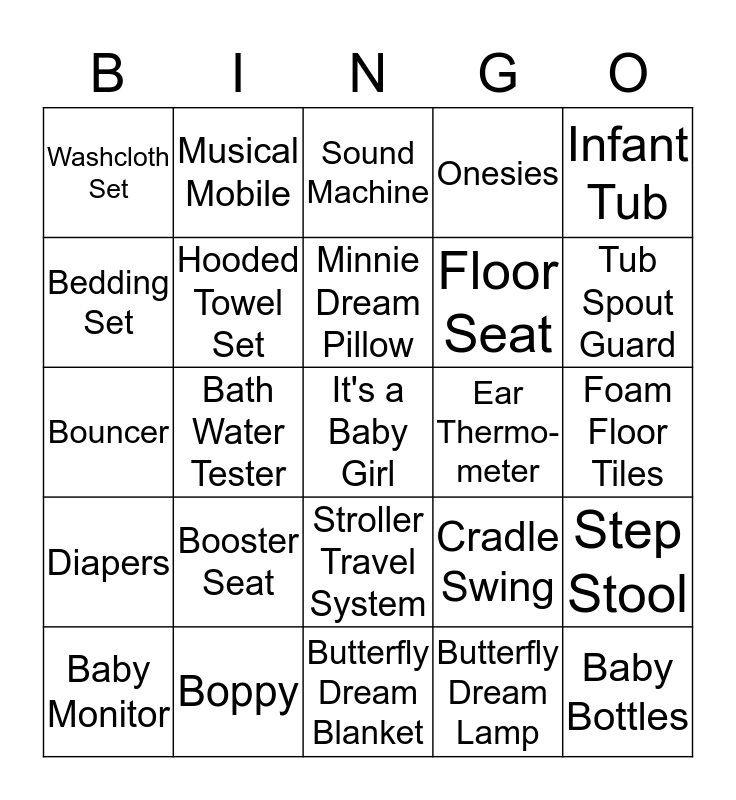 This bingo card has a free space and 24 words: Booster Seat, Boppy, Minnie Dream Pillow, Baby Monitor, Infant Tub, Washcloth Set, Bedding Set, Musical Mobile, Ear Thermo-meter, Stroller Travel System, Floor Seat, Bouncer, Cradle Swing, Step Stool, Hooded Towel Set, Butterfly Dream Lamp, Foam Floor Tiles, Sound Machine, Tub Spout Guard, Bath Water Tester, Baby Bottles, Diapers, Onesies and Butterfly Dream Blanket.