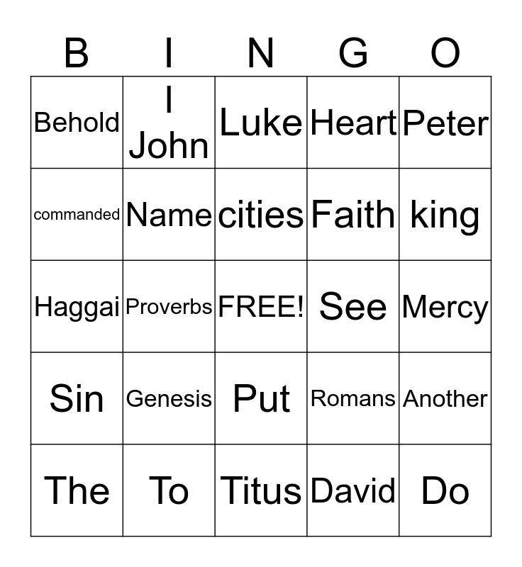 This bingo card has a free space and 24 words: Genesis, To, cities, The, Peter, Behold, commanded, I John, See, Put, Faith, Haggai, Romans, Another, Name, David, Mercy, Luke, king, Proverbs, Do, Sin, Heart and Titus.
