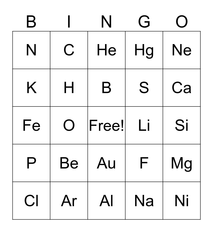 This bingo card has a free space and 24 words: Be, Ar, B, Cl, Ne, N, K, C, Li, Au, S, Fe, F, Mg, H, Na, Si, He, Ca, O, Ni, P, Hg and Al.