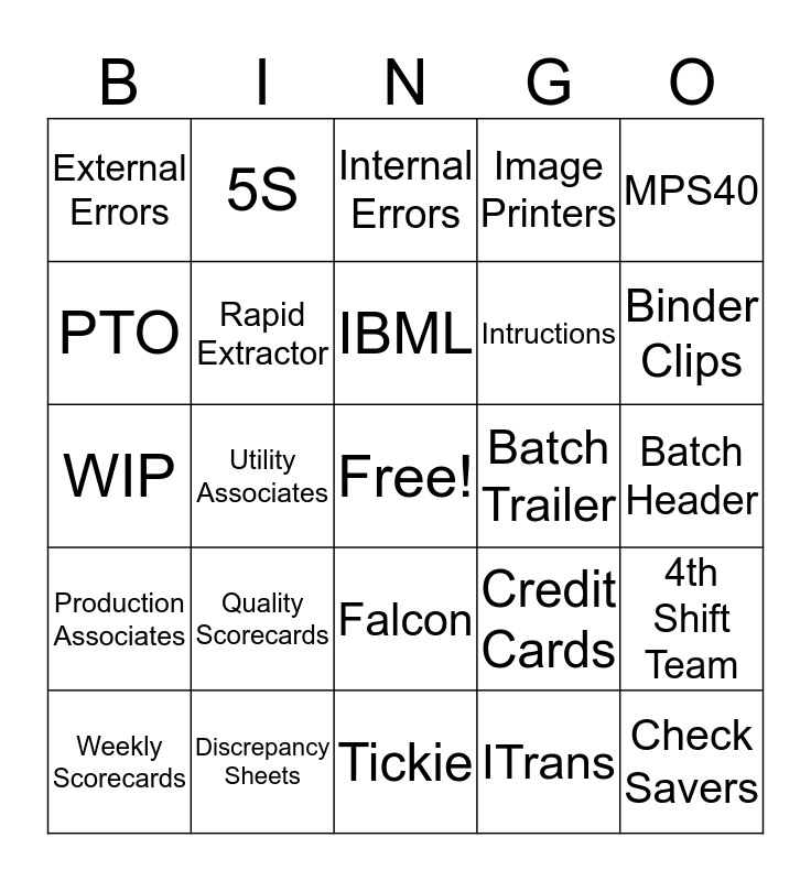 This bingo card has a free space and 24 words: Weekly Scorecards, Quality Scorecards, IBML, ITrans, MPS40, External Errors, 5S, Internal Errors, Batch Trailer, Batch Header, WIP, Rapid Extractor, Credit Cards, 4th Shift Team, PTO, Discrepancy Sheets, Tickie, Image Printers, Binder Clips, Production Associates, Utility Associates, Falcon, Intructions and Check Savers.