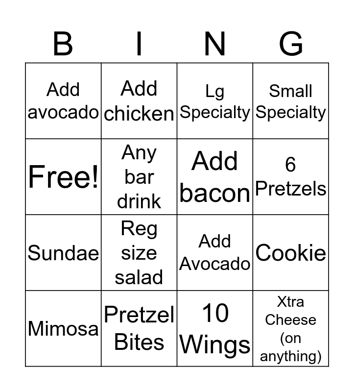 This bingo card has 16 words: Pretzel Bites, Cookie, Lg Specialty, Add avocado, Sundae, Add chicken, Add Avocado, 10 Wings, Free!, Any bar drink, Mimosa, Small Specialty, Reg size salad, 6 Pretzels, Add bacon and Xtra Cheese (on anything).