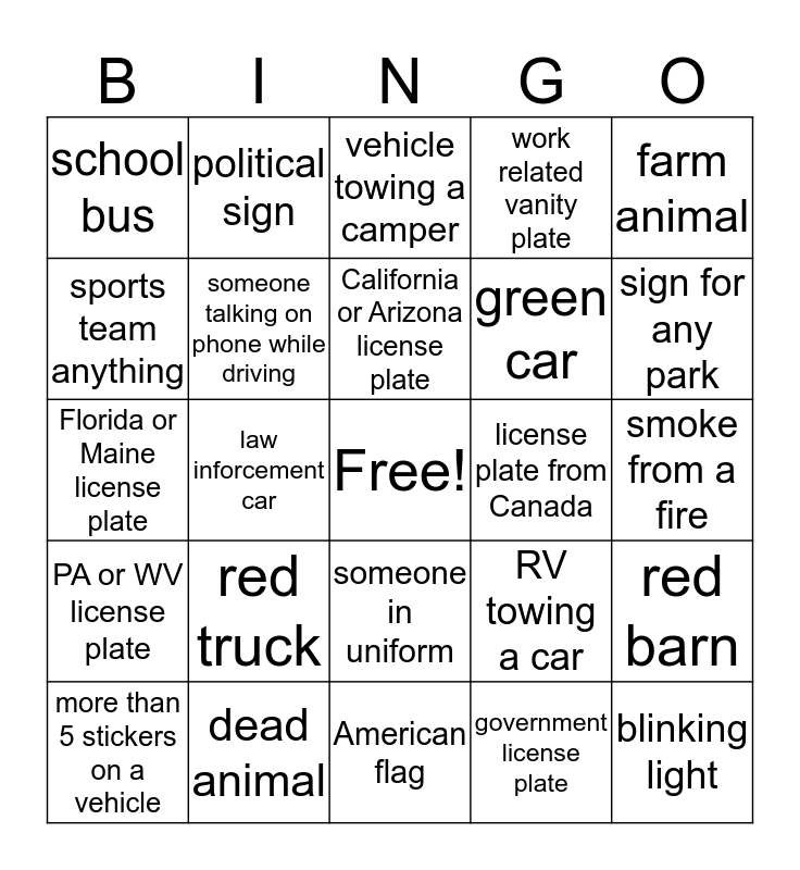 This bingo card has a free space and 24 words: red truck, dead animal, California or Arizona license plate, more than 5 stickers on a vehicle, farm animal, school bus, sports team anything, political sign, license plate from Canada, someone in uniform, green car, Florida or Maine license plate, RV towing a car, red barn, someone talking on phone while driving, government license plate, smoke from a fire, vehicle towing a camper, sign for any park, law inforcement car, blinking light, PA or WV license plate, work related vanity plate and American flag.