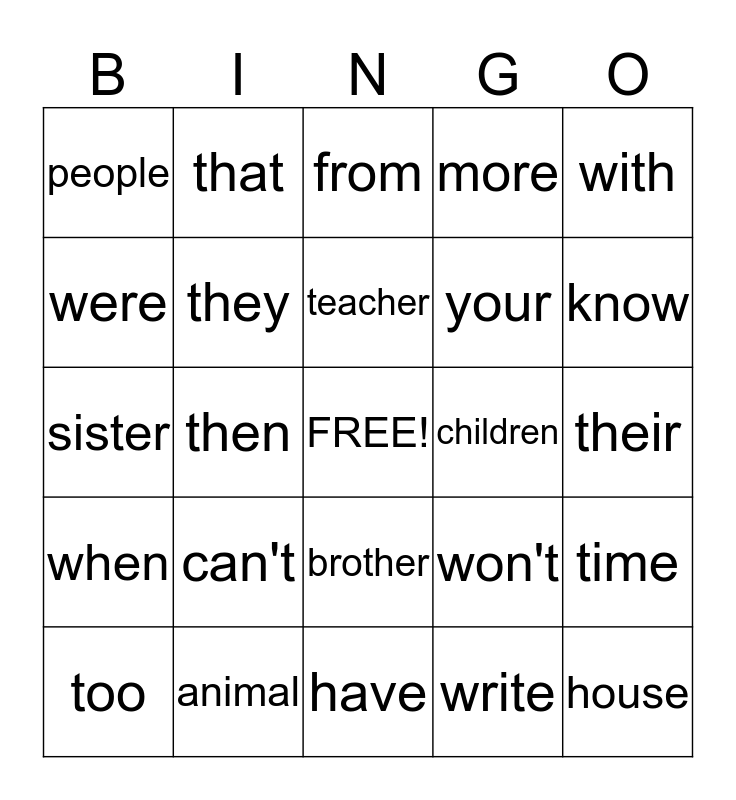 This bingo card has a free space and 24 words: can't, animal, teacher, too, with, people, were, that, children, brother, your, sister, won't, time, they, write, their, from, know, then, house, when, more and have.