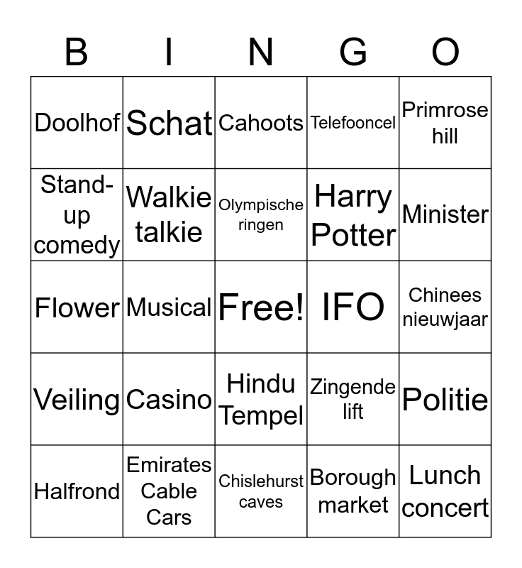 This bingo card has a free space and 24 words: Casino, Emirates Cable Cars, Olympische ringen, Halfrond, Primrose hill, Doolhof, Stand-up comedy, Schat, IFO, Hindu Tempel, Harry Potter, Flower, Zingende lift, Politie, Walkie talkie, Borough market, Chinees nieuwjaar, Cahoots, Minister, Musical, Lunch concert, Veiling, Telefooncel and Chislehurst caves.