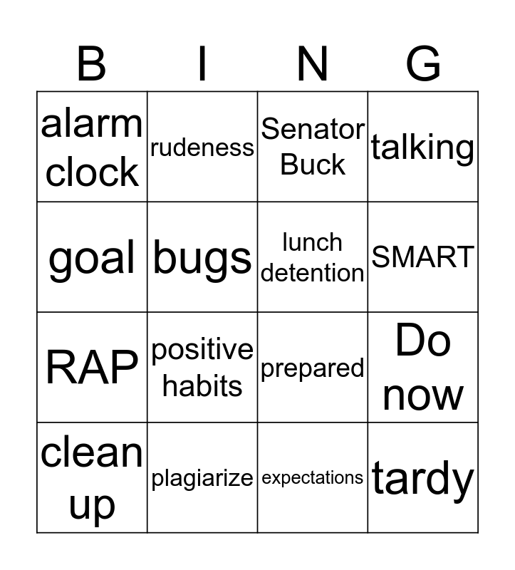 This bingo card has 26 words: Free!, Quarter, SMART, measurable, goal, alarm clock, bugs, rudeness, expectations, respect, RAP, prepared, language, no food, Do now, listen, talking, tardy, Senator Buck, clean up, positive habits, surgeons, plagiarize, consequences, lunch detention and raise your hand.