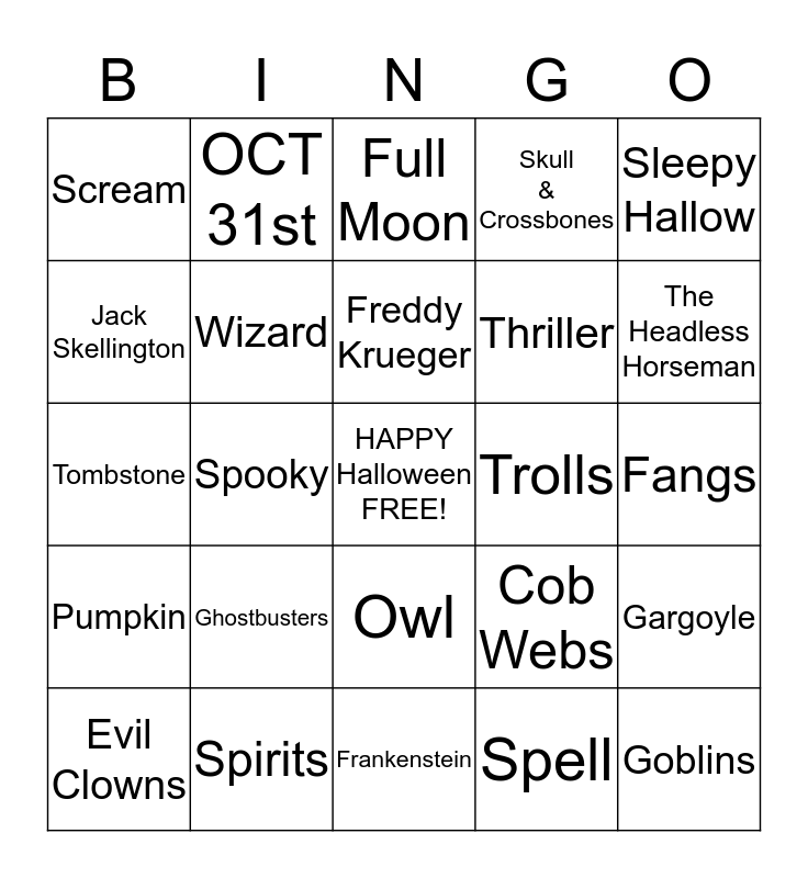 This bingo card has a free space and 24 words: Ghostbusters, Spirits, Freddy Krueger, Evil Clowns, Sleepy Hallow, Scream, Jack Skellington, OCT 31st, Trolls, Owl, Thriller, Tombstone, Cob Webs, Gargoyle, Wizard, Spell, Fangs, Full Moon, The Headless Horseman, Spooky, Goblins, Pumpkin, Skull & Crossbones and Frankenstein.