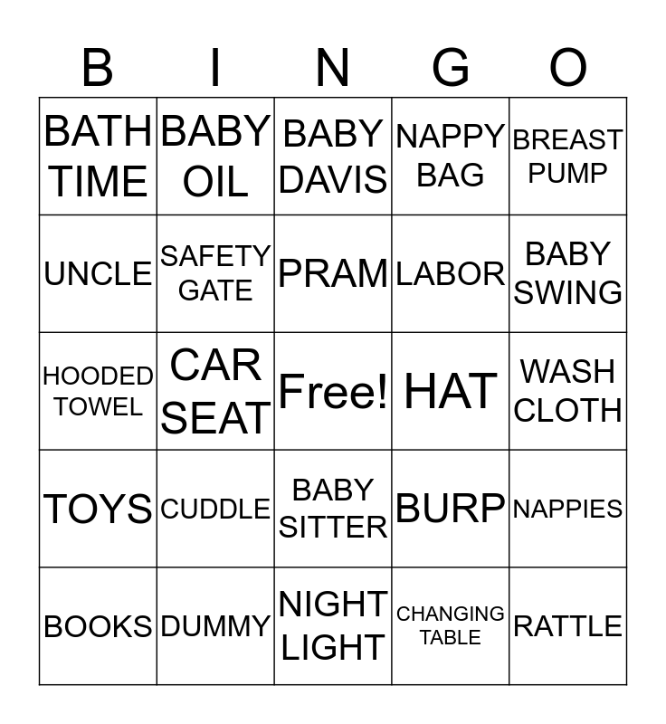 This bingo card has a free space and 54 words: NEWBORN, CUDDLE, MUM, DAD, BASSINET, ONESIE, BABY OIL, BLANKET, LABOR, WIPES, BATH TIME, LOTION, BABY SITTER, BURP, SOCKS, BOOKS, CAR SEAT, BABY DAVIS, TEETHING, NAPPIES, TOYS, DUMMY, PRAM, NAPPY BAG, AUNTY, UNCLE, BOY, NEPHEW, MILK, LULABY, TEDY BEAR, HIGH CHAIR, BIB, BOTTLE, BREAST PUMP, BABY FOOD, SAFETY GATE, NIGHT LIGHT, CHANGING TABLE, BABY SWING, RASH CREAM, BABY TOY, TEETHING RING, TUMMY TIME, RATTLE, BABY, BOOTIES, BOTTLE WARMER, HAT, WASH CLOTH, HOODED TOWEL, CRIB, BABY SHAMPOO and BABY TOWEL.