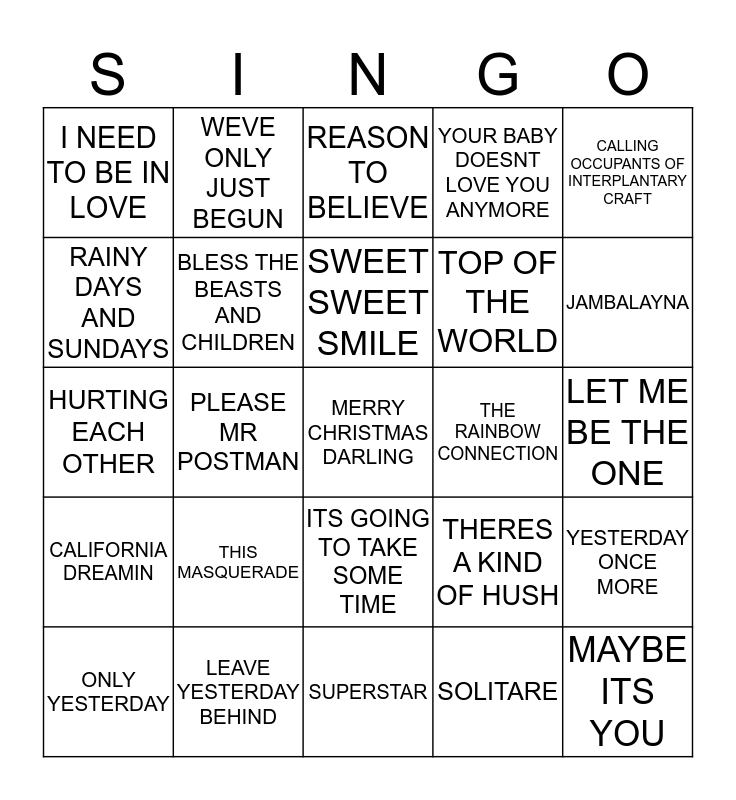 This bingo card has 25 words: THIS MASQUERADE, SUPERSTAR, SWEET SWEET SMILE, ONLY YESTERDAY, CALLING OCCUPANTS OF INTERPLANTARY CRAFT, I NEED TO BE IN LOVE, RAINY DAYS AND SUNDAYS, WEVE ONLY JUST BEGUN, THE RAINBOW CONNECTION, ITS GOING TO TAKE SOME TIME, TOP OF THE WORLD, HURTING EACH OTHER, THERES A KIND OF HUSH, YESTERDAY ONCE MORE, BLESS THE BEASTS AND CHILDREN, MAYBE ITS YOU, LET ME BE THE ONE, REASON TO BELIEVE, JAMBALAYNA, PLEASE MR POSTMAN, MERRY CHRISTMAS DARLING, LEAVE YESTERDAY BEHIND, CALIFORNIA DREAMIN, YOUR BABY DOESNT LOVE YOU ANYMORE and SOLITARE.