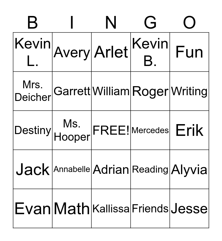 This bingo card has a free space and 24 words: Annabelle, Math, William, Evan, Fun, Kevin L., Mrs. Deicher, Avery, Mercedes, Adrian, Roger, Destiny, Reading, Alyvia, Garrett, Friends, Erik, Arlet, Writing, Ms. Hooper, Jesse, Jack, Kevin B. and Kallissa.