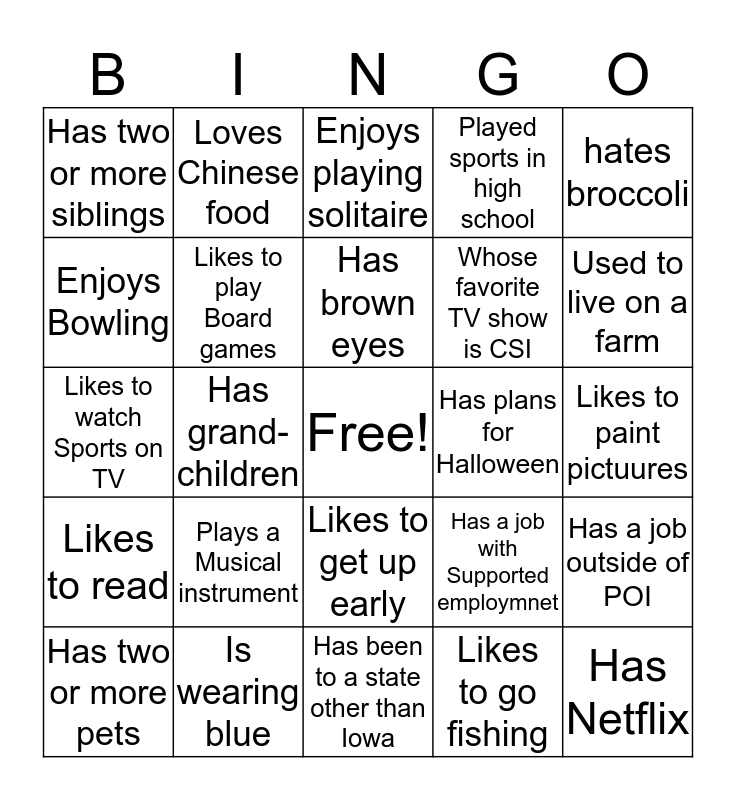 This bingo card has a free space and 24 words: Plays a Musical instrument, Is wearing blue, Has brown eyes, Has two or more pets, hates broccoli, Has two or more siblings, Enjoys Bowling, Loves Chinese food, Has plans for Halloween, Likes to get up early, Whose favorite TV show is CSI, Likes to watch Sports on TV, Has a job with Supported employmnet, Has a job outside of POI, Likes to play Board games, Likes to go fishing, Likes to paint pictuures, Enjoys playing solitaire, Used to live on a farm, Has grand-children, Has Netflix, Likes to read, Played sports in high school and Has been to a state other than Iowa.