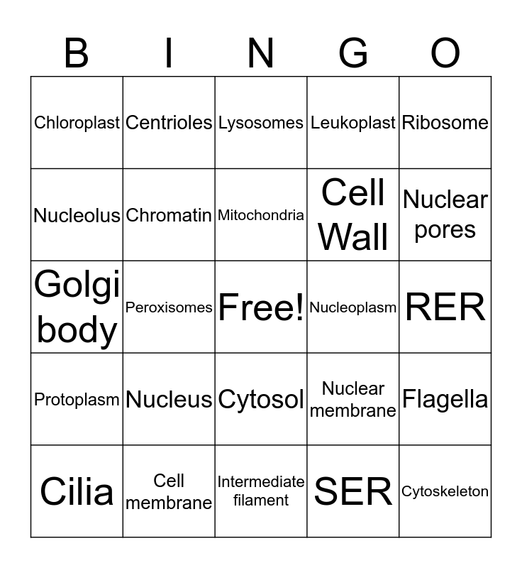 This bingo card has a free space and 24 words: Nucleus, Cell membrane, Mitochondria, Cilia, Ribosome, Chloroplast, Nucleolus, Centrioles, Nucleoplasm, Cytosol, Cell Wall, Golgi body, Nuclear membrane, Flagella, Chromatin, SER, RER, Lysosomes, Nuclear pores, Peroxisomes, Cytoskeleton, Protoplasm, Leukoplast and Intermediate filament.
