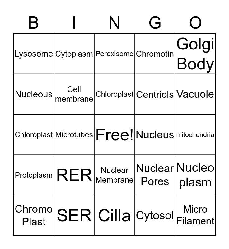 This bingo card has a free space and 24 words: RER, SER, Chloroplast, Chromo Plast, Golgi Body, Lysosome, Nucleous, Cytoplasm, Nucleus, Nuclear Membrane, Centriols, Chloroplast, Nuclear Pores, Nucleo plasm, Cell membrane, Cytosol, mitochondria, Peroxisome, Vacuole, Microtubes, Micro Filament, Protoplasm, Chromotin and Cilla.