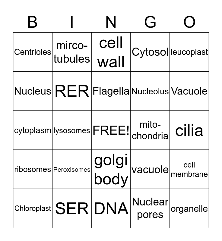 This bingo card has a free space and 24 words: Peroxisomes, SER, Flagella, Chloroplast, leucoplast, Centrioles, Nucleus, mirco-tubules, mito-chondria, golgi body, Nucleolus, cytoplasm, vacuole, cell membrane, RER, Nuclear pores, cilia, cell wall, Vacuole, lysosomes, organelle, ribosomes, Cytosol and DNA.