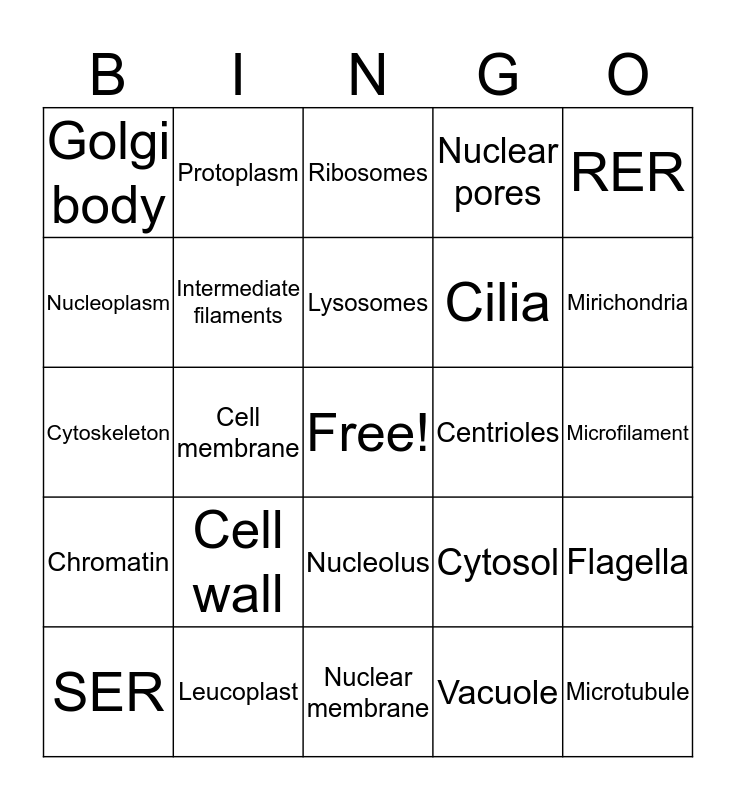 This bingo card has a free space and 24 words: Cell wall, Leucoplast, Lysosomes, SER, RER, Golgi body, Nucleoplasm, Protoplasm, Centrioles, Nucleolus, Cilia, Cytoskeleton, Cytosol, Flagella, Intermediate filaments, Vacuole, Microfilament, Ribosomes, Mirichondria, Cell membrane, Microtubule, Chromatin, Nuclear pores and Nuclear membrane.