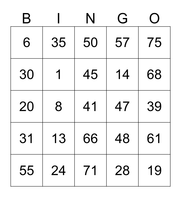 This bingo card has a free space and 24 words: 13, 24, 45, 55, 75, 6, 30, 35, 47, 66, 14, 20, 48, 61, 1, 28, 39, 50, 68, 8, 19, 31, 57 and 71.