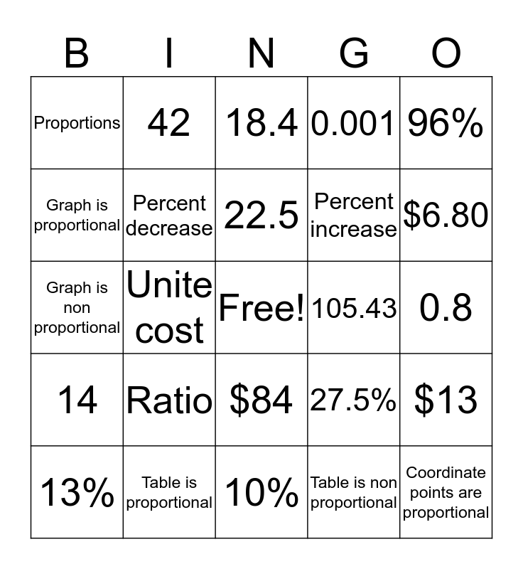 This bingo card has a free space and 24 words: Ratio, Table is proportional, 22.5, 13%, 96%, Proportions, Graph is proportional, 42, 105.43, $84, Percent increase, Graph is non proportional, 27.5%, $13, Percent decrease, Table is non proportional, 0.8, 18.4, $6.80, Unite cost, Coordinate points are proportional, 14, 0.001 and 10%.