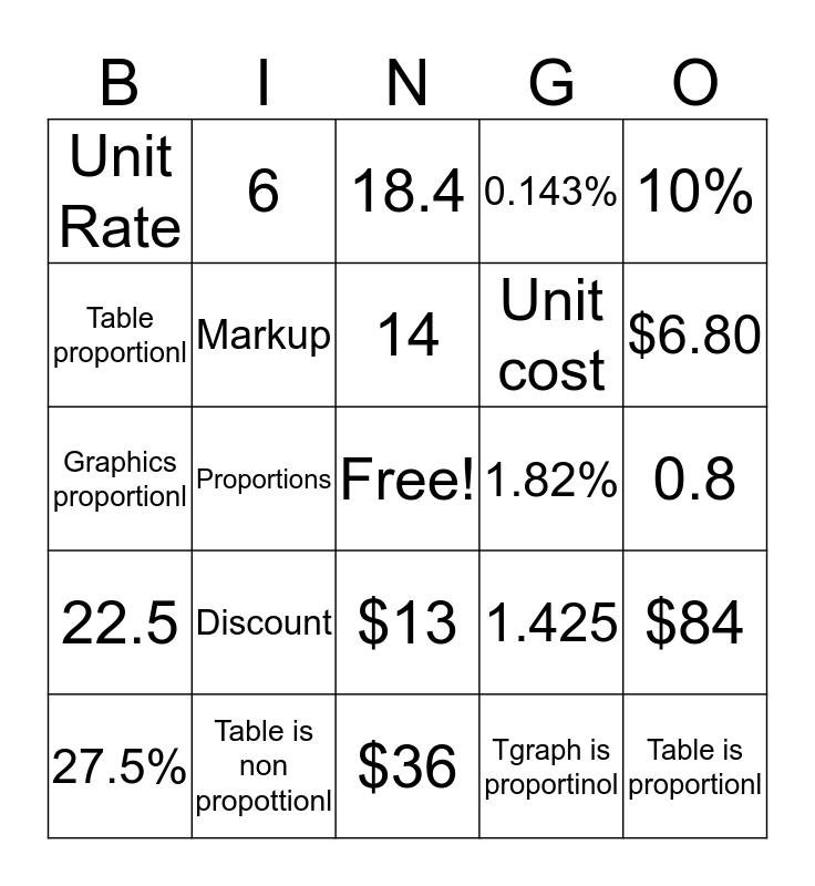 This bingo card has a free space and 24 words: Discount, Table is non propottionl, 14, 27.5%, 10%, Unit Rate, Table proportionl, 6, 1.82%, $13, Unit cost, Graphics proportionl, 1.425, $84, Markup, Tgraph is proportinol, 0.8, 18.4, $6.80, Proportions, Table is proportionl, 22.5, 0.143% and $36.