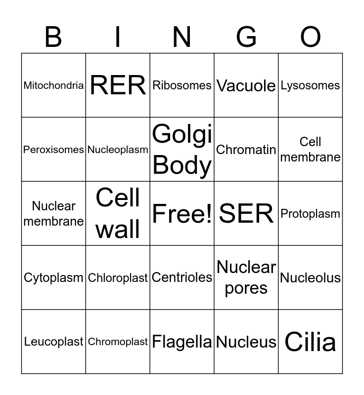 This bingo card has a free space and 24 words: Chloroplast, Chromoplast, Golgi Body, Leucoplast, Lysosomes, Mitochondria, Peroxisomes, RER, SER, Centrioles, Chromatin, Nuclear membrane, Nuclear pores, Nucleolus, Nucleoplasm, Nucleus, Protoplasm, Ribosomes, Cell membrane, Cell wall, Cilia, Cytoplasm, Vacuole and Flagella.