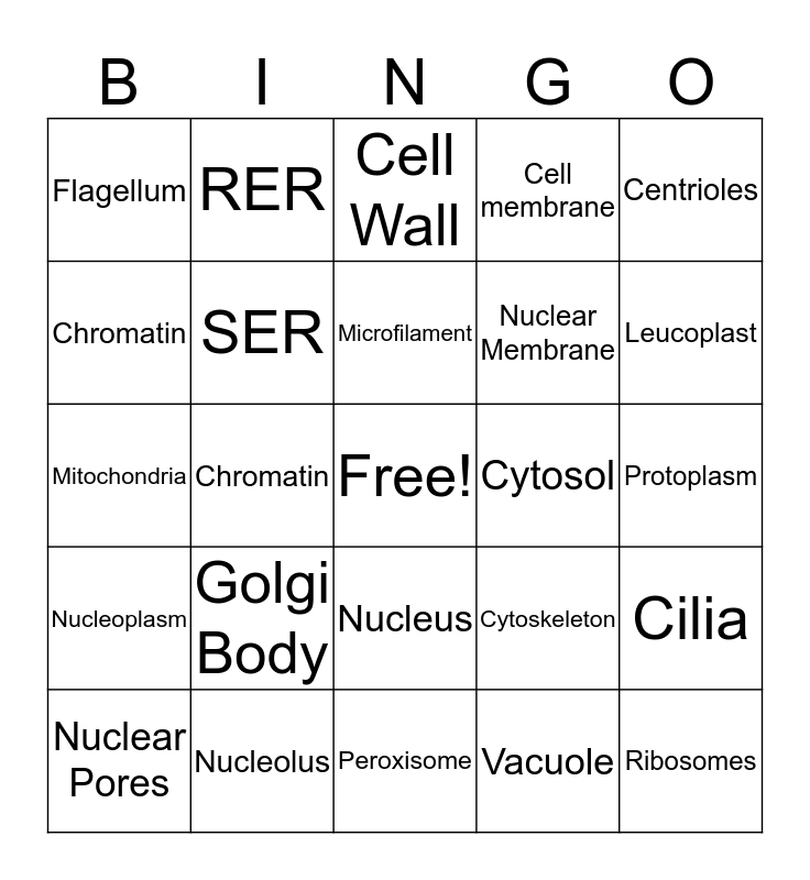 This bingo card has a free space and 24 words: Golgi Body, Nucleolus, Microfilament, Nuclear Pores, Centrioles, Flagellum, Chromatin, RER, Cytosol, Nucleus, Nuclear Membrane, Mitochondria, Cytoskeleton, Cilia, SER, Vacuole, Protoplasm, Cell Wall, Leucoplast, Chromatin, Ribosomes, Nucleoplasm, Cell membrane and Peroxisome.