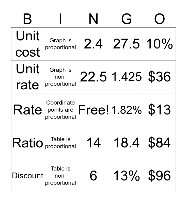 This bingo card has a free space and 24 words: Discount, Table is proportional, 22.5, 13%, 10%, Unit cost, Graph is proportional, 2.4, 1.82%, $13, Rate, Graph is non-proportional, 18.4, $84, Unit rate, Table is non-proportional, 6, 27.5, $36, Ratio, Coordinate points are proportional, 14, 1.425 and $96.