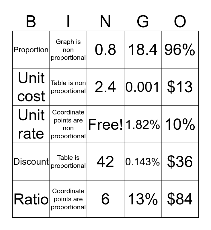 This bingo card has a free space and 24 words: Ratio, Table is proportional, 2.4, 13%, 96%, Proportion, Graph is non proportional, 0.8, 1.82%, 10%, Unit rate, Table is non proportional, 0.143%, $36, Unit cost, Coordinate points are proportional, 6, 18.4, $13, Discount, Coordinate points are non proportional, 42, 0.001 and $84.