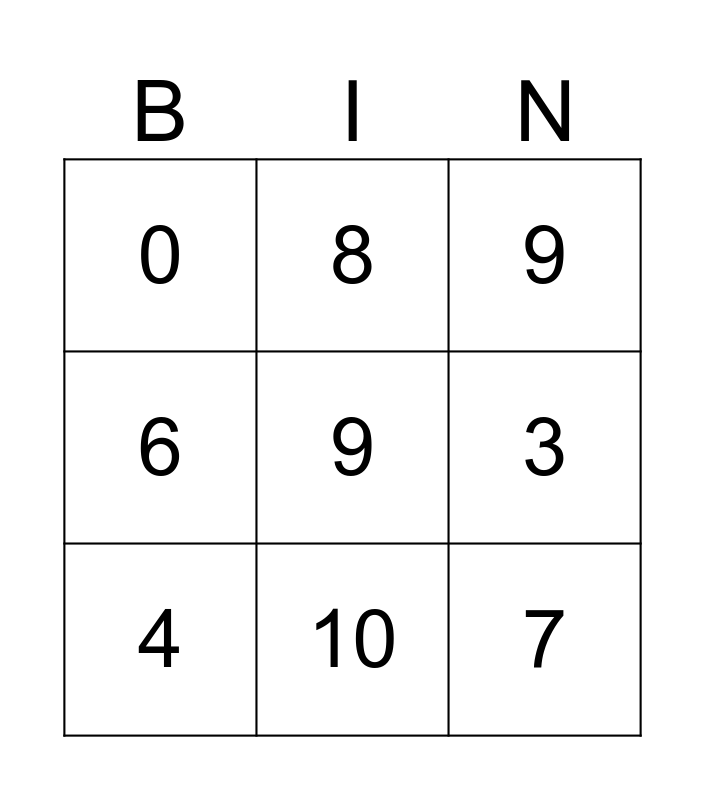 This bingo card has a free space and 14 words: 5, 1, 4, 8, 6, 7, Free!, 2, 10, 0, 6, 3, 9 and 5.