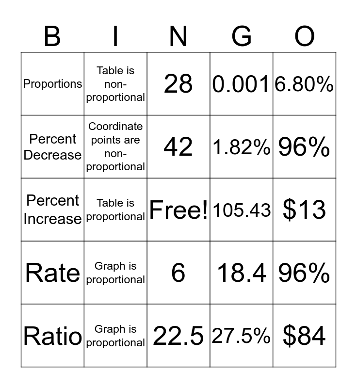 This bingo card has a free space and 24 words: Ratio, Graph is proportional, 42, 27.5%, 6.80%, Proportions, Table is non-proportional, 28, 105.43, $13, Percent Increase, Coordinate points are non-proportional, 18.4, 96%, Percent Decrease, Graph is proportional, 22.5, 0.001, 96%, Rate, Table is proportional, 6, 1.82% and $84.