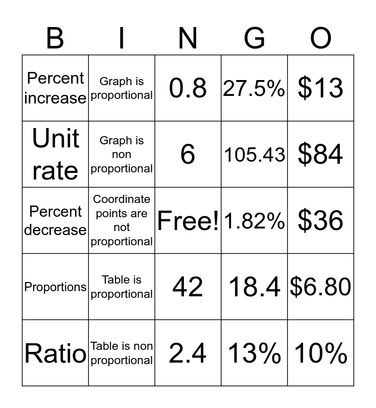 This bingo card has a free space and 24 words: Ratio, Table is proportional, 6, 13%, $13, Percent increase, Graph is proportional, 0.8, 1.82%, $36, Percent decrease, Graph is non proportional, 18.4, $6.80, Unit rate, Table is non proportional, 2.4, 27.5%, $84, Proportions, Coordinate points are not proportional, 42, 105.43 and 10%.