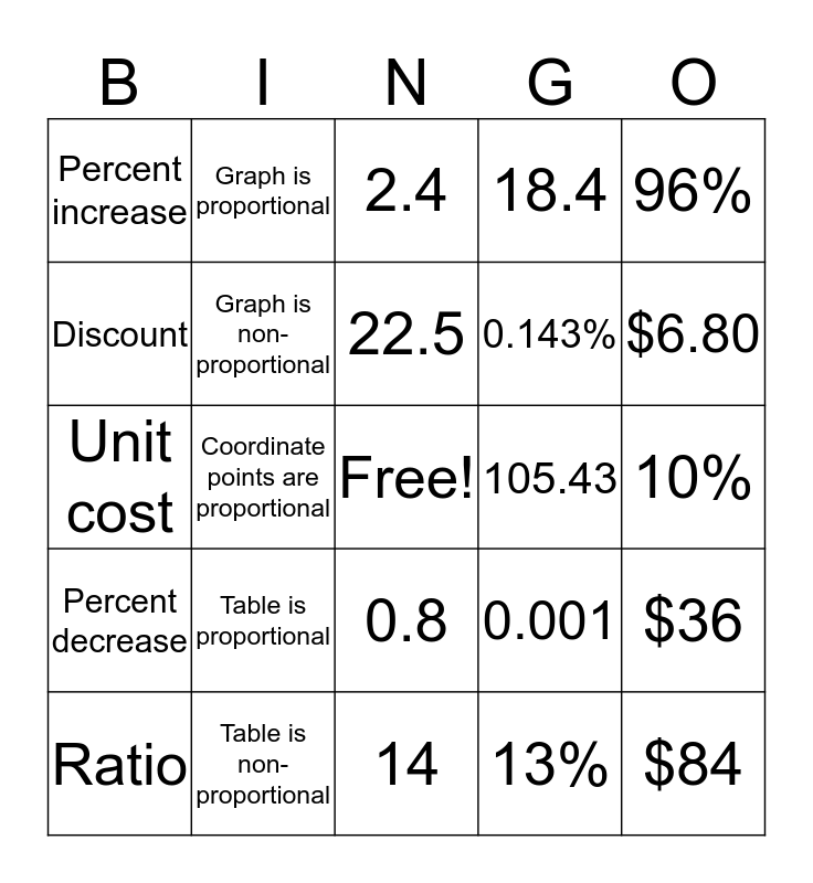 This bingo card has a free space and 24 words: Ratio, Table is proportional, 22.5, 13%, 96%, Percent increase, Graph is proportional, 2.4, 105.43, 10%, Unit cost, Graph is non-proportional, 0.001, $36, Discount, Table is non-proportional, 14, 18.4, $6.80, Percent decrease, Coordinate points are proportional, 0.8, 0.143% and $84.