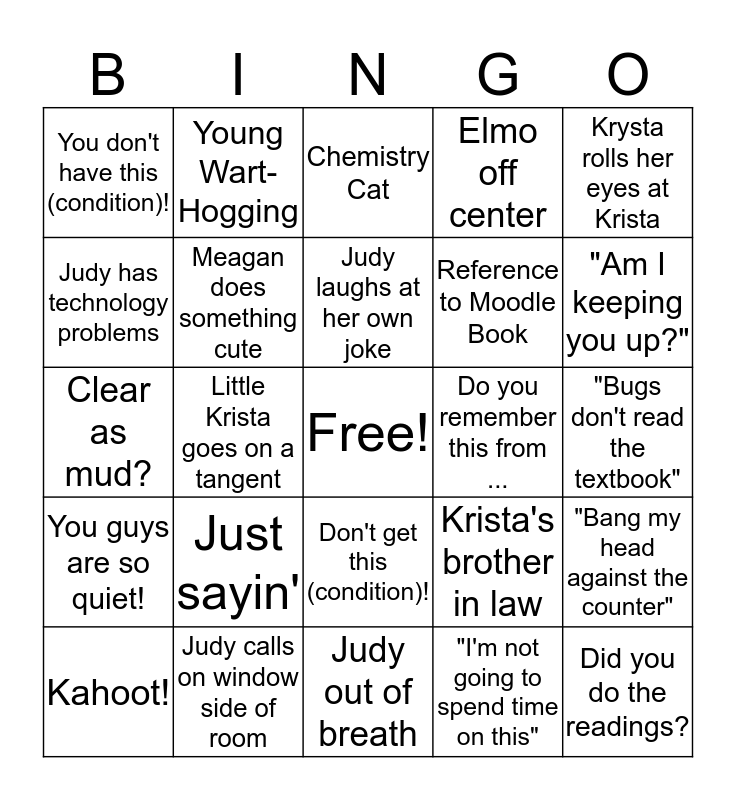 This bingo card has a free space and 24 words: Just sayin', Judy calls on window side of room, Judy laughs at her own joke, Kahoot!, Krysta rolls her eyes at Krista, You don't have this (condition)!, Judy has technology problems, Young Wart-Hogging, Do you remember this from ..., Don't get this (condition)!, Reference to Moodle Book, Clear as mud?, Krista's brother in law, "Bang my head against the counter", Meagan does something cute, "I'm not going to spend time on this", "Bugs don't read the textbook", Chemistry Cat, "Am I keeping you up?", Little Krista goes on a tangent, Did you do the readings?, You guys are so quiet!, Elmo off center and Judy out of breath.