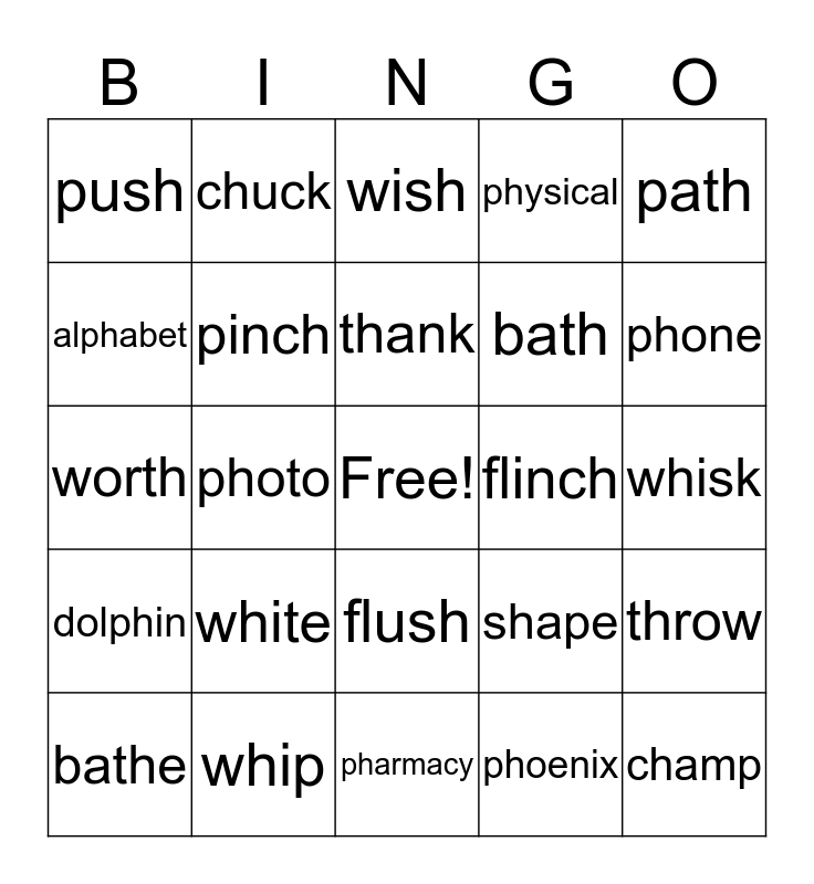This bingo card has a free space and 24 words: white, whip, thank, bathe, path, push, alphabet, chuck, flinch, flush, bath, worth, shape, throw, pinch, phoenix, whisk, wish, phone, photo, champ, dolphin, physical and pharmacy.