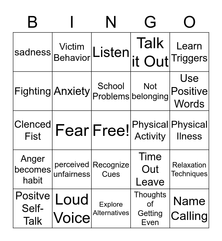 This bingo card has a free space and 24 words: perceived unfairness, Loud Voice, School Problems, Positve Self-Talk, Learn Triggers, sadness, Fighting, Victim Behavior, Physical Activity, Recognize Cues, Not belonging, Clenced Fist, Time Out Leave, Relaxation Techniques, Anxiety, Thoughts of Getting Even, Physical Ilness, Listen, Use Positive Words, Fear, Name Calling, Anger becomes habit, Talk it Out and Explore Alternatives.