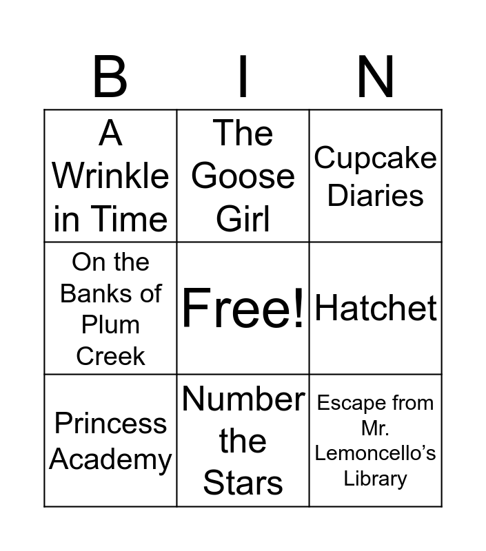 This bingo card has a free space and 9 words: Princess Academy, The Goose Girl, Hatchet, A Wrinkle in Time, Cupcake Diaries, On the Banks of Plum Creek, Number the Stars, Escape from Mr. Lemoncello’s Library and Nothings fair in 5th grade.