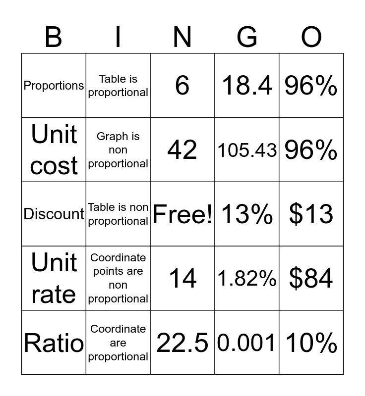 This bingo card has a free space and 24 words: Ratio, Coordinate points are non proportional, 42, 0.001, 96%, Proportions, Table is proportional, 6, 13%, $13, Discount, Graph is non proportional, 1.82%, $84, Unit cost, Coordinate are proportional, 22.5, 18.4, 96%, Unit rate, Table is non proportional, 14, 105.43 and 10%.