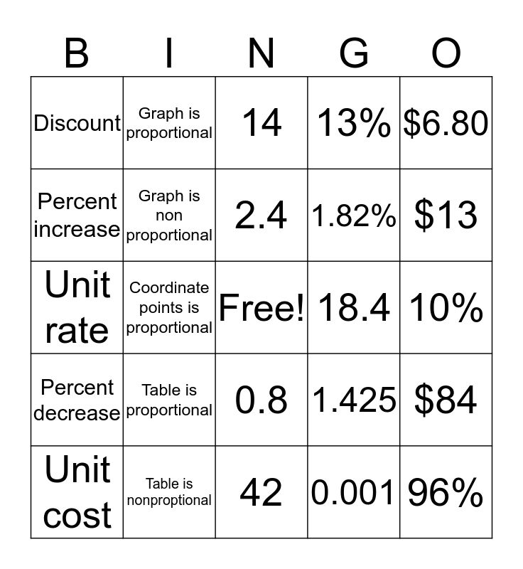 This bingo card has a free space and 24 words: Unit cost, Table is proportional, 2.4, 0.001, $6.80, Discount, Graph is proportional, 14, 18.4, 10%, Unit rate, Graph is non proportional, 1.425, $84, Percent increase, Table is nonproptional, 42, 13%, $13, Percent decrease, Coordinate points is proportional, 0.8, 1.82% and 96%.