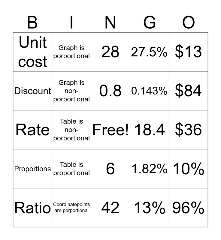 This bingo card has a free space and 24 words: Ratio, Table is proportional, 0.8, 13%, $13, Unit cost, Graph is porportional, 28, 18.4, $36, Rate, Graph is non-porportional, 1.82%, 10%, Discount, Coordinatepoints are porportional, 42, 27.5%, $84, Proportions, Table is non-porportional, 6, 0.143% and 96%.