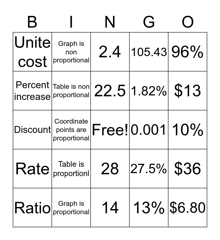 This bingo card has a free space and 24 words: Ratio, Table is proportionl, 22.5, 13%, 96%, Unite cost, Graph is non proportional, 2.4, 0.001, 10%, Discount, Table is non proportional, 27.5%, $36, Percent increase, Graph is proportional, 14, 105.43, $13, Rate, Coordinate points are proportional, 28, 1.82% and $6.80.