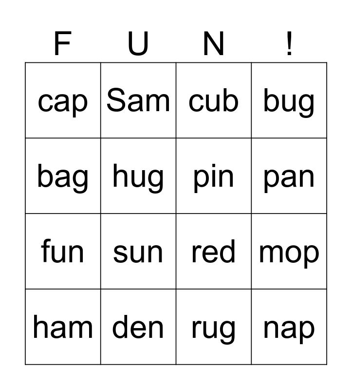 This bingo card has 16 words: den, mop, cub, cap, fun, Sam, red, rug, bag, hug, ham, bug, sun, pan, pin and nap.