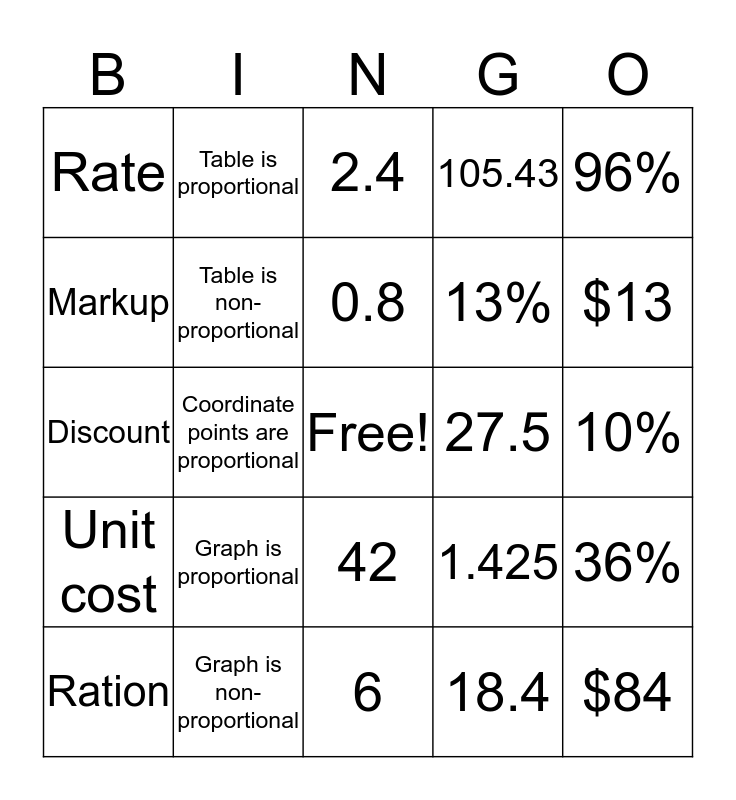 This bingo card has a free space and 24 words: Ration, Graph is proportional, 0.8, 18.4, 96%, Rate, Table is proportional, 2.4, 27.5, 10%, Discount, Table is non-proportional, 1.425, 36%, Markup, Graph is non-proportional, 6, 105.43, $13, Unit cost, Coordinate points are proportional, 42, 13% and $84.