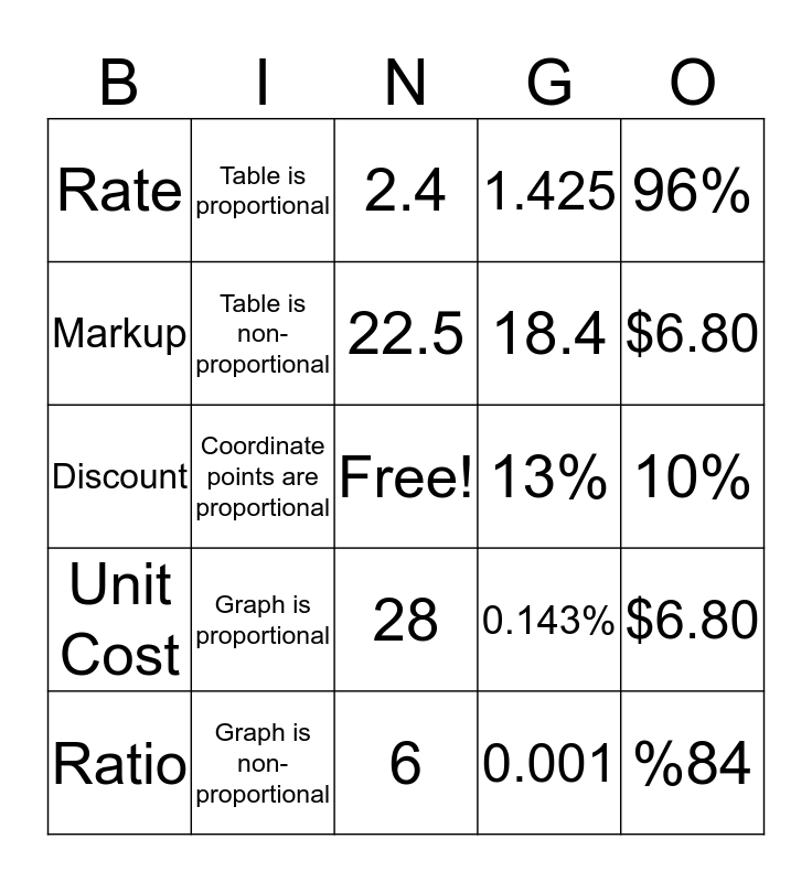 This bingo card has a free space and 24 words: Ratio, Graph is proportional, 22.5, 0.001, 96%, Rate, Table is proportional, 2.4, 13%, 10%, Discount, Table is non-proportional, 0.143%, $6.80, Markup, Graph is non-proportional, 6, 1.425, $6.80, Unit Cost, Coordinate points are proportional, 28, 18.4 and %84.