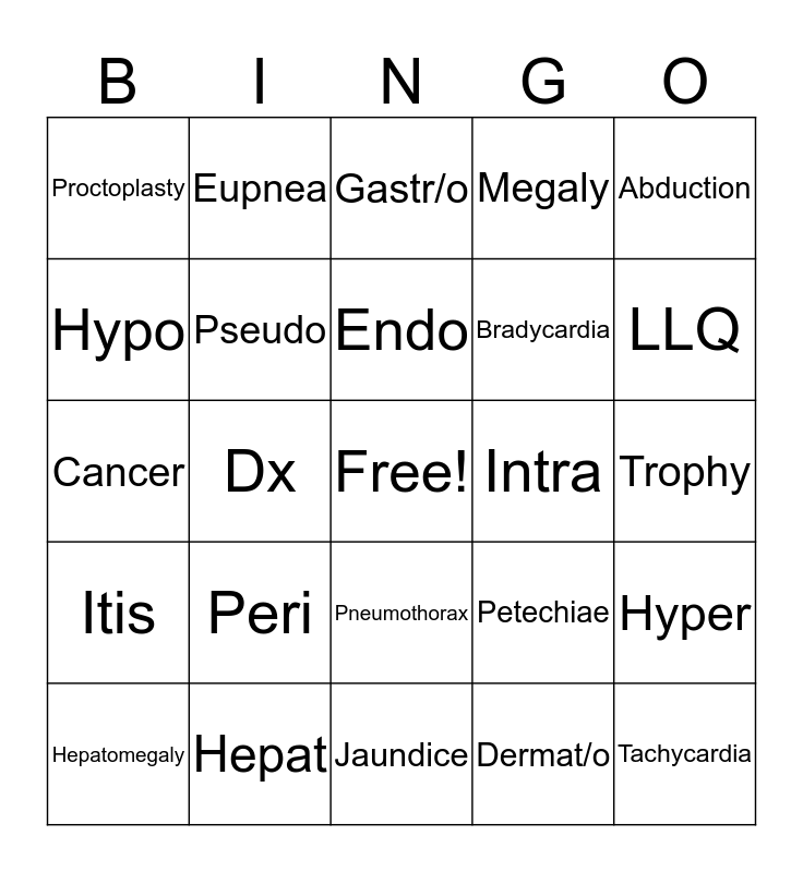 This bingo card has a free space and 24 words: Peri, Hepat, Endo, Hepatomegaly, Abduction, Proctoplasty, Hypo, Eupnea, Intra, Pneumothorax, Bradycardia, Cancer, Petechiae, Hyper, Pseudo, Dermat/o, Trophy, Gastr/o, LLQ, Dx, Tachycardia, Itis, Megaly and Jaundice.