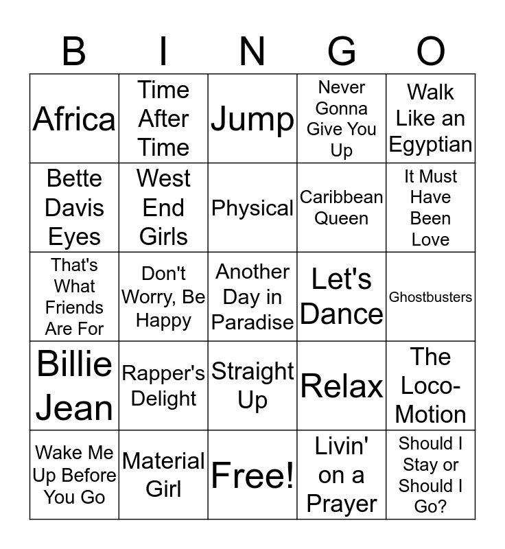 This bingo card has 25 words: Billie Jean, Material Girl, Another Day in Paradise, Livin' on a Prayer, Walk Like an Egyptian, Africa, Time After Time, Jump, Let's Dance, The Loco-Motion, Bette Davis Eyes, West End Girls, Free!, Relax, It Must Have Been Love, Wake Me Up Before You Go, Don't Worry, Be Happy, Physical, Caribbean Queen, Ghostbusters, That's What Friends Are For, Rapper's Delight, Straight Up, Never Gonna Give You Up and Should I Stay or Should I Go?.